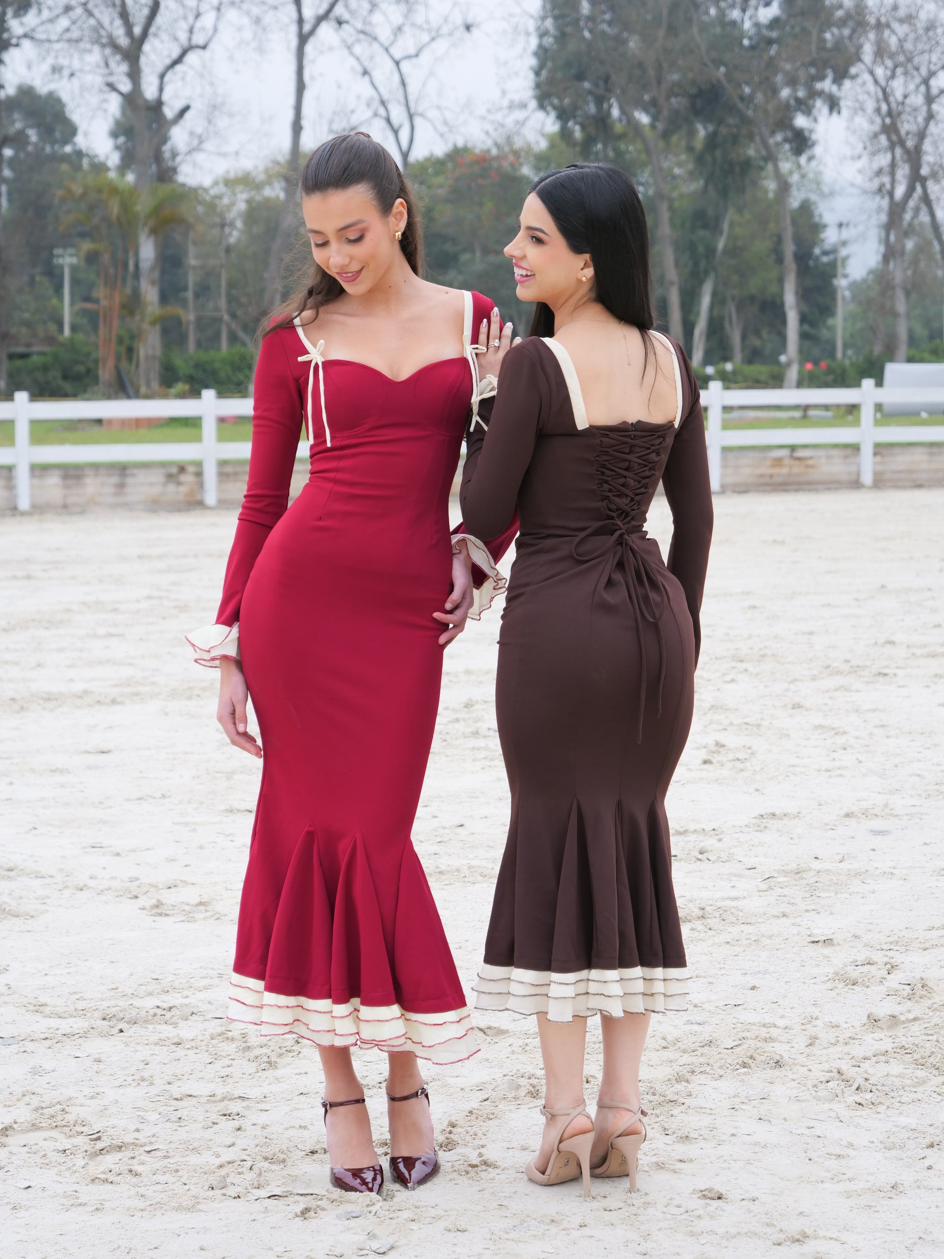 Su falda sirena con vuelo en el bajo aporta movimiento y sofisticación, mientras los delicados lazos en los hombros y el contraste de color en mangas y basta lo convierten en una pieza inolvidable.
