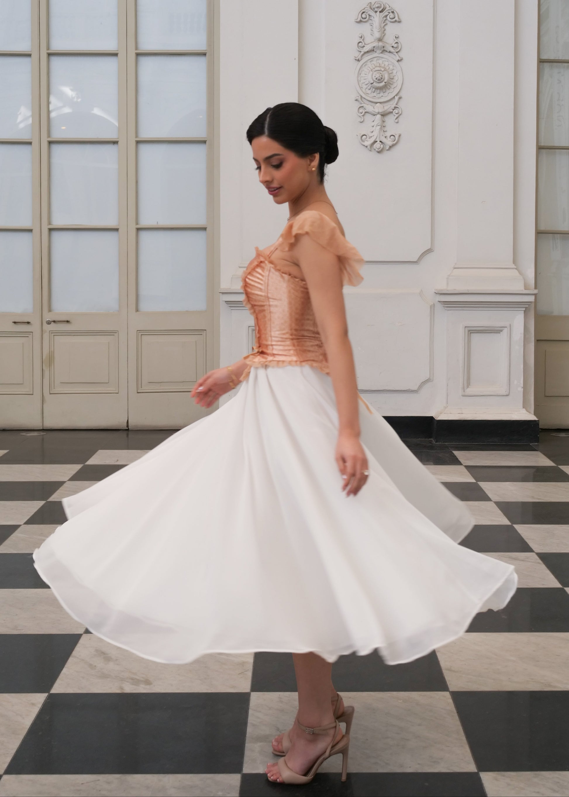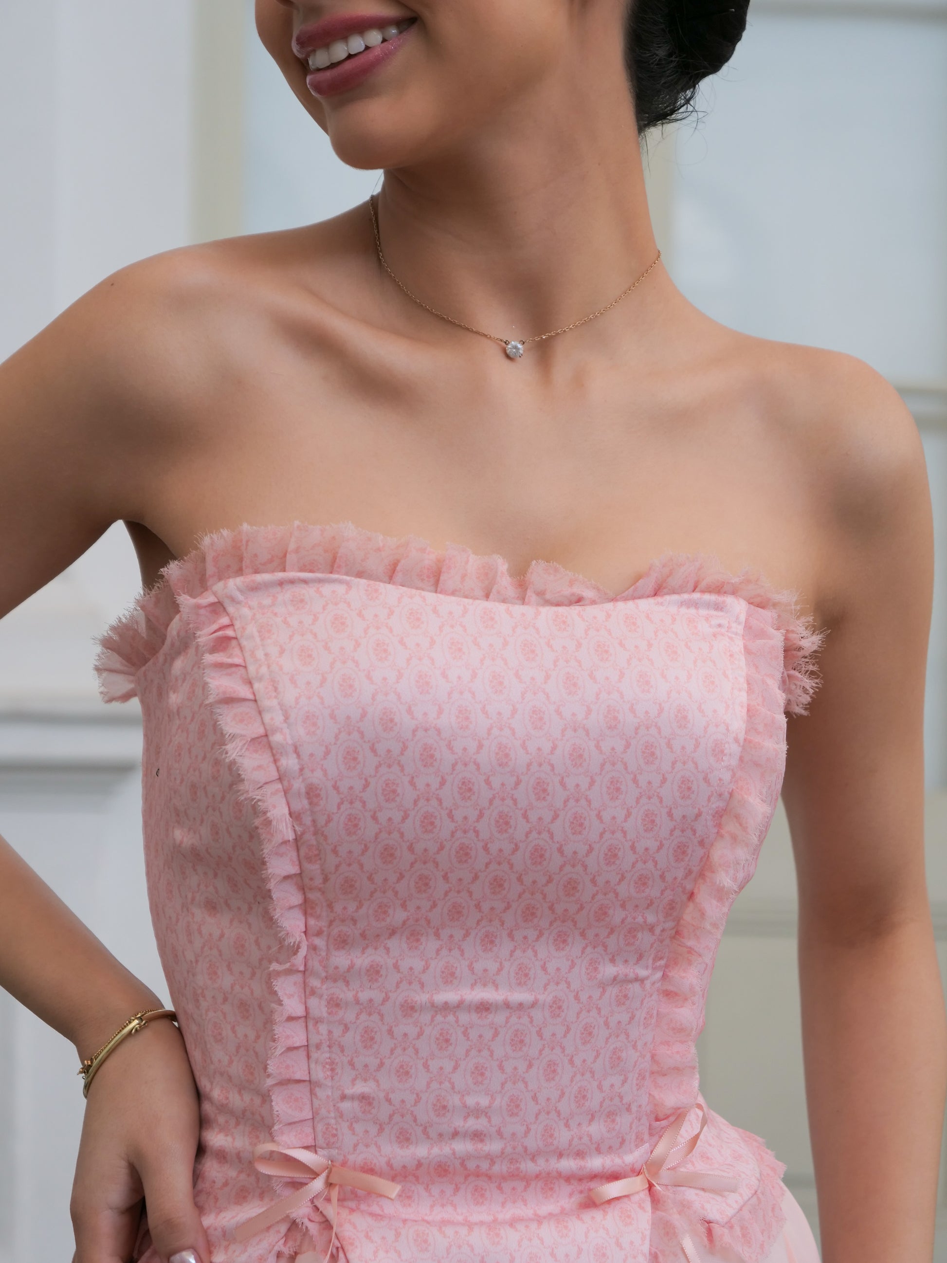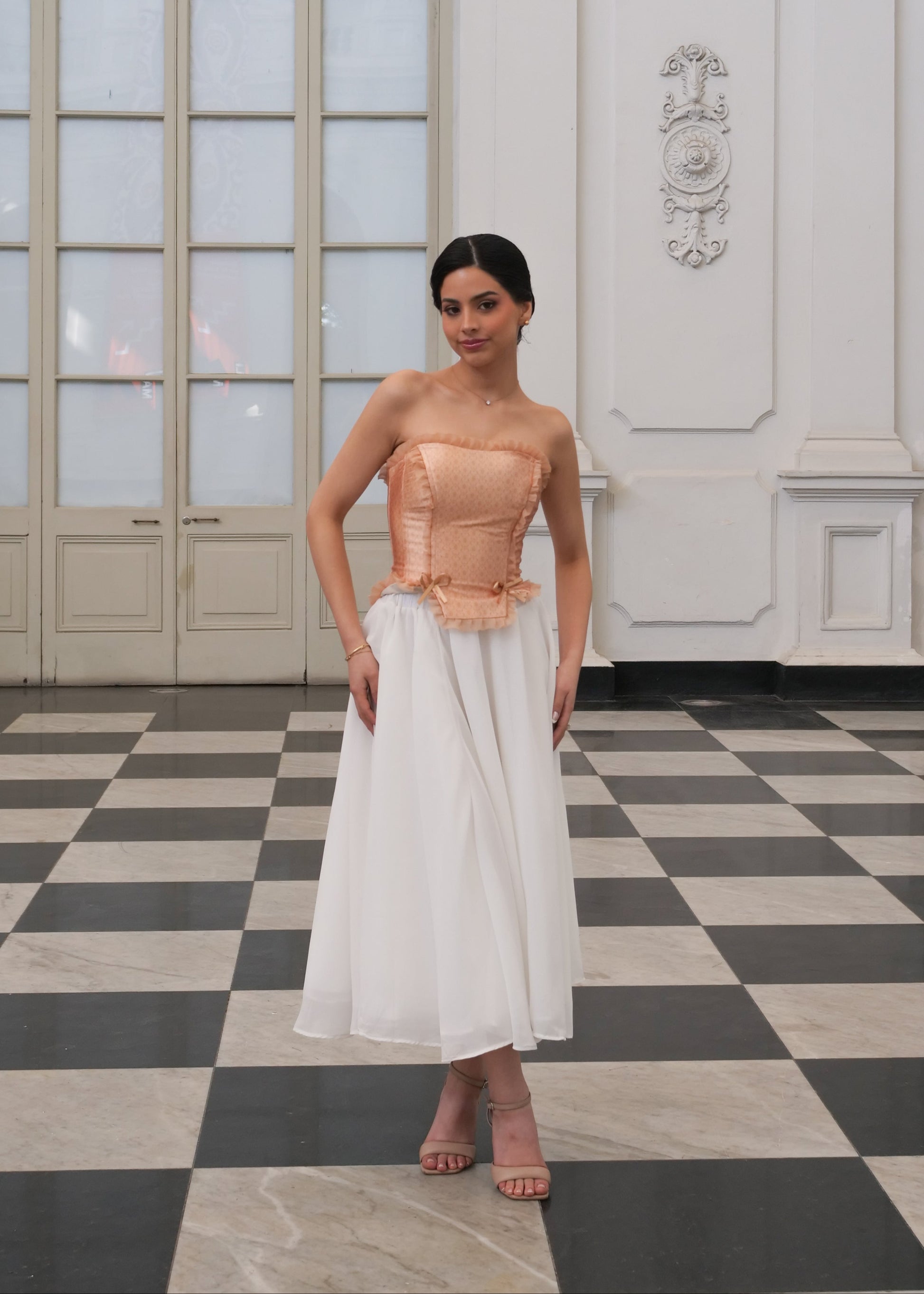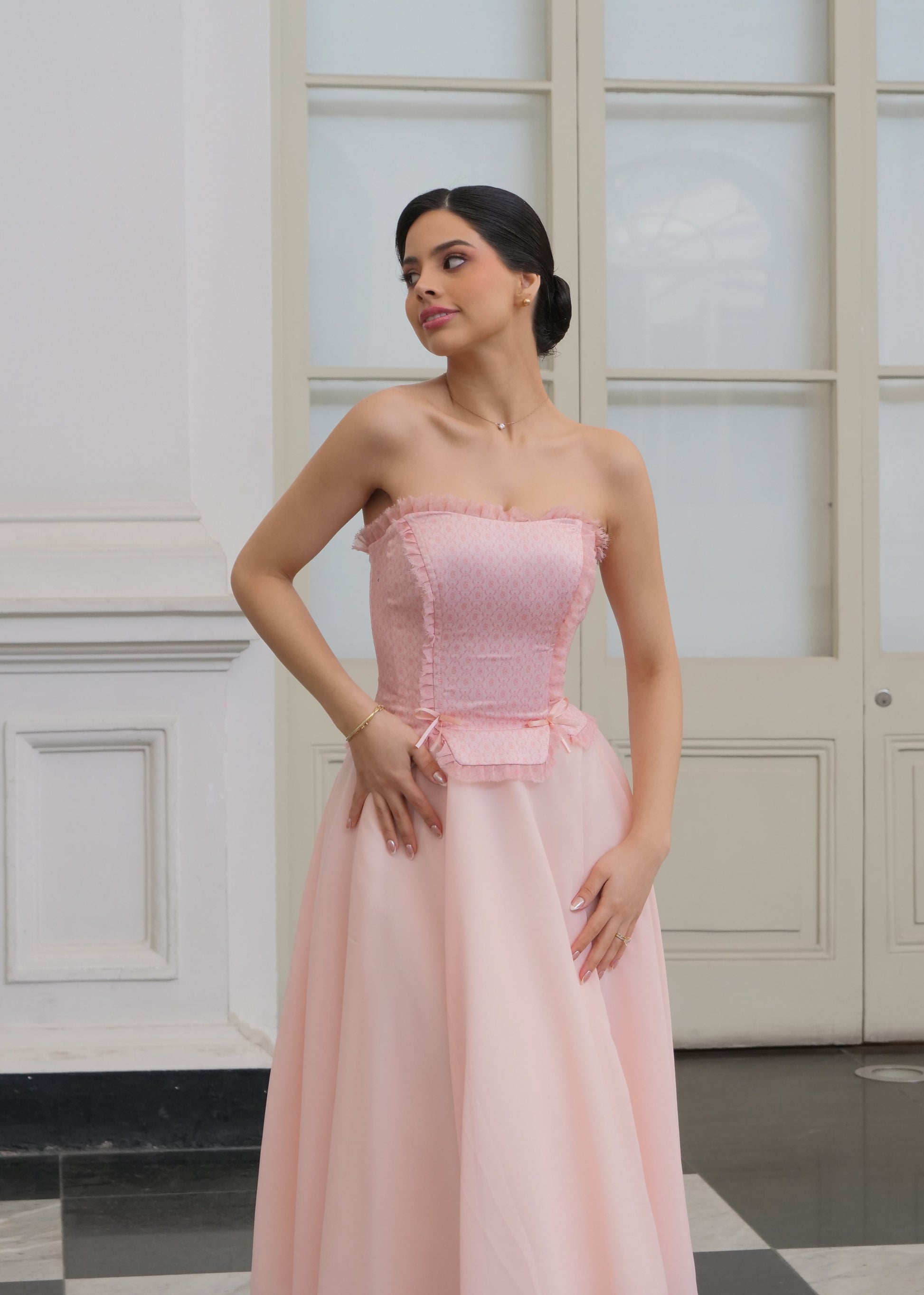 Su estructura resalta la silueta con elegancia, mientras que sus mangas intercambiables permiten transformarlo según tu esencia del día: strapless, manga corta o larga. Cada detalle —desde los delicados lazos hasta la caída sutil de los volantes— evoca feminidad y poder en perfecta armonía.